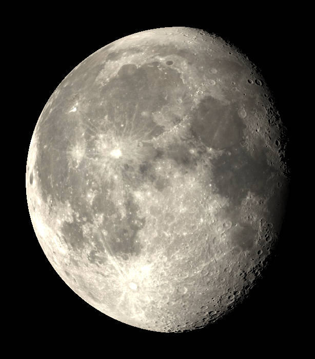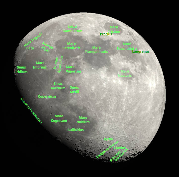 The Moon 1½ days past full, as seen tonight, March 3, 2026 at 9 PM. A view visible in small telescopes showing an image with and without selected features labeled. Created using Stellarium, LibreOffice Draw, and GIMP.