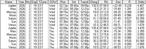 This is a low precision ephemeris of the Sun, Moon and naked eye planet positions for today and tomorrow, February 18th and 19th, 2026. Some of the columns are self-explanatory, others are not. The transit column is the time that the body crosses the meridian and is due south. Elong, for elongation, is the angle between the Sun and that body. RA is right ascension, which is the object’s east-west position on the celestial sphere in hours and minutes. Dec is declination which is the north-south position of the object on the celestial sphere in degrees and minutes. R is the distance of that object from the Sun in astronomical units. An astronomical unit is about 93 million miles or 150 million kilometers. And Delta is the distance of that object from the Earth, also in astronomical units. I omit the ‘m’ in am and pm for compactness. The data was generated using my LookingUp for DOS app and displayed as a table by my Ephemeris Helper app.