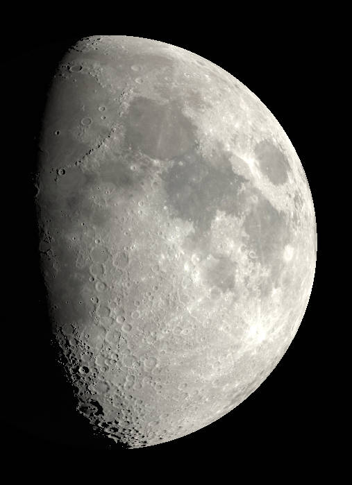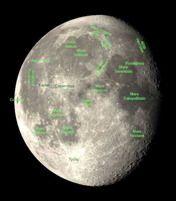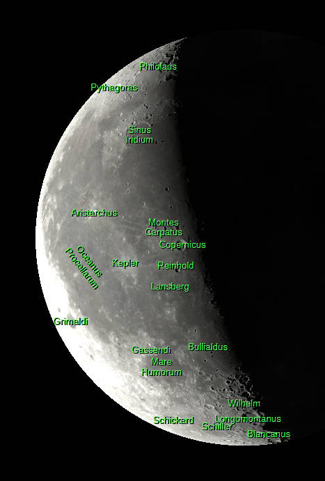 The Moon three days past first quarter, as seen this evening, January 28, 2026. A view visible in small telescopes showing an image with and without selected features labeled. Created using Stellarium, LibreOffice Draw, and GIMP.
