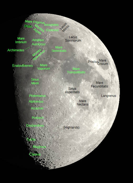 The Moon, at first quarter, as seen at 9 PM tonight, March 25, 2026. A view visible in small telescopes showing an image with and without selected features labeled. Created using Stellarium, LibreOffice Draw, and GIMP.