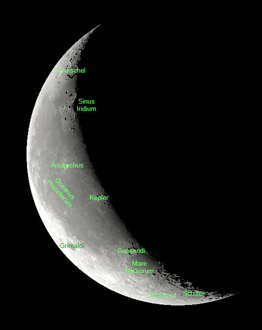 The Moon 1½ days past first quarter, as seen tonight, February 25, 2026. A view visible in small telescopes showing an image with and without selected features labeled. Created using Stellarium, LibreOffice Draw, and GIMP.