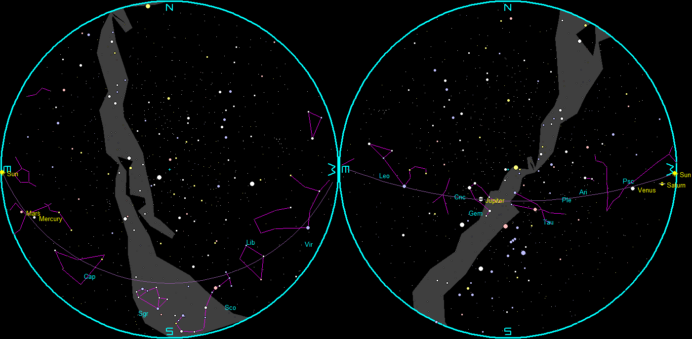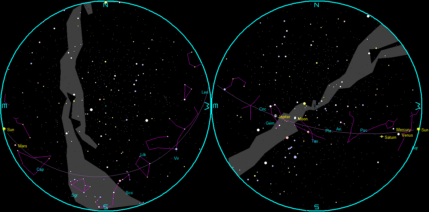 Jupiter and Venus with the constellations of the Zodiac at 9 PM.