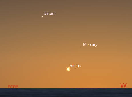 Saturn with Mercury and Venus in the west-southwestern sky at 7 PM tonight February 25, 2026, or 35 minutes after sunset. Spotting Mercury and Venus will be problematic: being too low in Venus' case, and too faint in Mercury's.