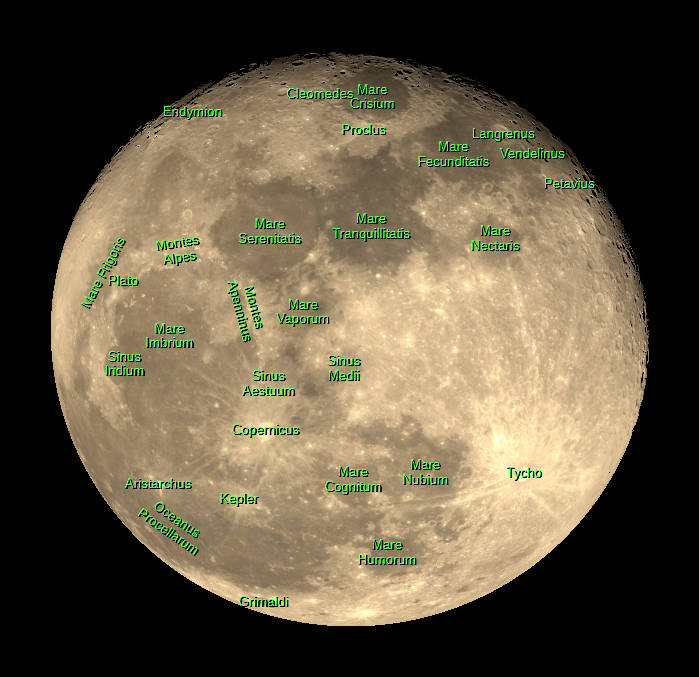 The full Moon as seen at 10 PM tonight, April 1, 2026. A view visible in small telescopes showing an image with and without selected features labeled. Created using Stellarium, LibreOffice Draw, and GIMP.
