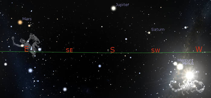 Named stars that are shown in the image above are Nunki, from an ancient tablet of thirty stars – The proclaimer of the sea. This is because the next four constellations to the east are water constellations: Capricornus, the sea goat; Aquarius, the water bearer; Pisces the fish; and Piscis Australis, the southern fish. Antares, in Scorpius, is of course the Rival of Mars, due to its reddish hue, and Mars passes Antares regularly on its journey through the Zodiac. An archer has to have his bow. Kaus Australis is the southern bow star. The star above that is Kaus Media, the middle bow star. And the star above and left of that is Kaus Borealis, the northern bow star. The constellation art that comes with Stellarium doesn’t match up with the stars of the bow.