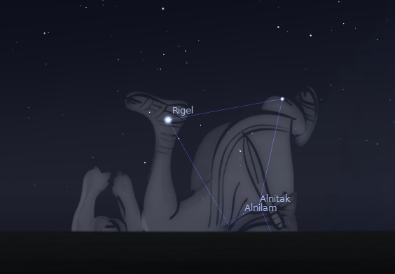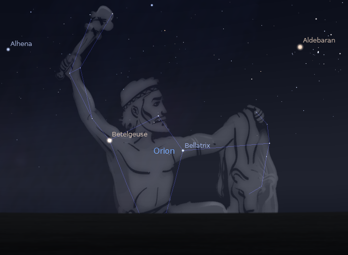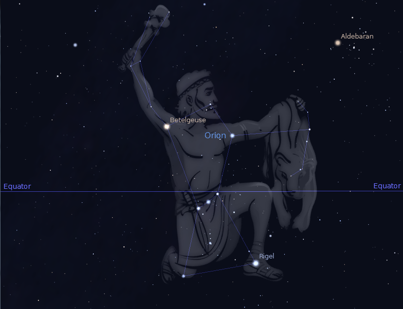Orion from mid latitudes north of the equator. Orion would be upside down if viewed south of the equator. Created using Stellarium.