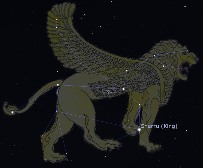 The Babylonian concept of the constellation Leo. They called it Urgulu, meaning lion. It represented their god Latarak. The star they called Sharru, meaning King we know as Regulus, which is the diminutive of king.