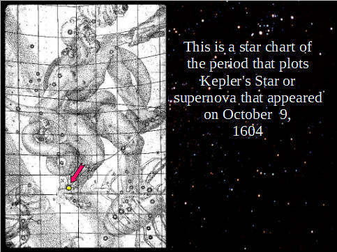 Kepler also discovered a supernova, the last one seen in the Milky Way. This is an old star chart that records Kepler’s Star,