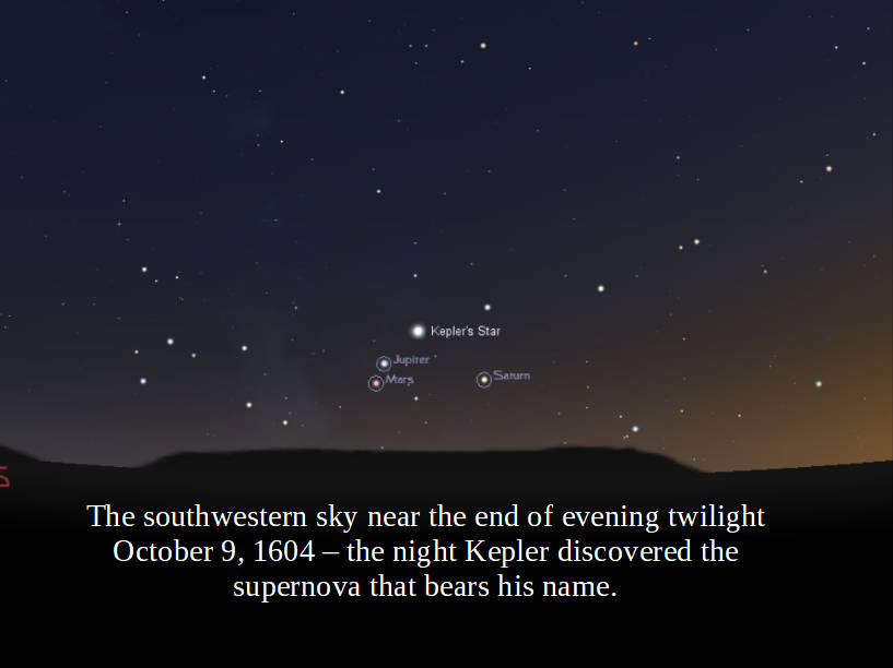 Here is a Stellarium recreation of the sky the night of his discovery. It’s the southwestern sky near the end of evening twilight, October 9, 1604, the night Kepler discovered the supernova that bears his name. It got him to thinking, could a similar grouping of a nova and planets be the Star of Bethlehem?