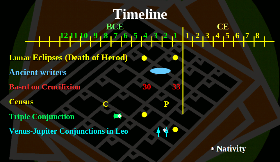 This is a timeline I developed of the events surrounding the Birth of Jesus. On the top line in yellow are the two eclipses of the Moon that occurred in the time period we’re interested in: 4 BCE and 1 BCE. One of then was the eclipse Josephus mentions that occurred shortly before the death of Herod the Great, who was alive to greet the Magi, who came to Jerusalem seeking the newborn King of the Jews. The second line highlights 3 and 2 BCE that the early Christian writers Irenaeus, Tertullian and Clement of Alexandria based Jesus’ birth year to Roman events which can be pegged to the Roman Calendar which has a direct relationship to our own calendar. The next line contains hits based on the Crucifixion of Jesus at age 33, where the Last Supper was a Seder on the first day of Passover. The next line with C and P are two censuses of Augustus in our time period. The next to the last line shows the relation of the triple conjunction in 7 BCE with Jesus’ birth and Herod’s death. The bottom line related the two Venus-Jupiter conjunctions with Jesus’ birth and Herod’s death.