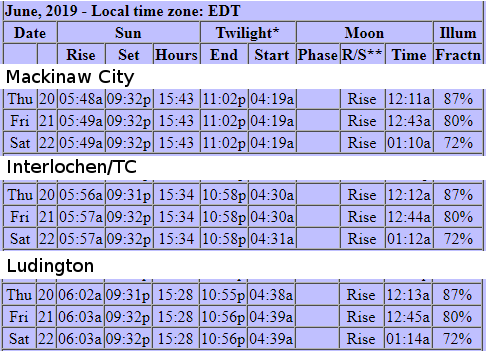 On my Ephemeris website, not to be confused with the blog that you are now reading, I have rise and set calendars for: Cadillac, Interlochen/Traverse City (Source for times on the Ephemeris program), Ludington, Mackinaw City, Petoskey, Eagle Harbor – Keweenaw Peninsula, Houghton Lake, and Earth’s Equator at the Prime Meridian. Go Here: http://ephemeris.bjmoler.org/calendar.htm.