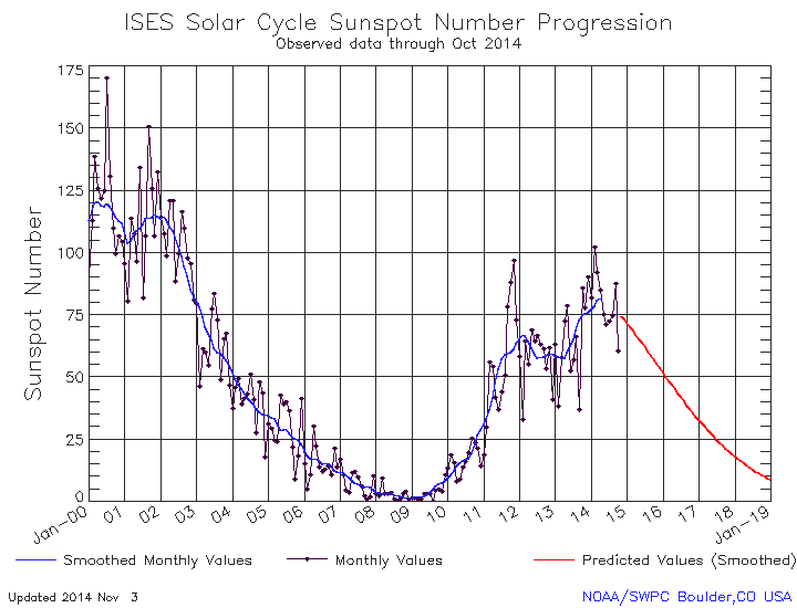 It looks like maybe we’ve hit the peak of sunspots in this 11 year solar cycle. Actually this cycle had two peaks, the latter part of 2012 when the world ended. You do remember the world ending two years ago on December 21st. How soon we forget. The second peak in this solar cycle occurred in the first three months of this year. The sunspot cycle 24 so far appears to be the weakest since cycle 12 in the 1880s. The time of the peak can only be determined in hindsight. Of course this weak sunspot cycle produced the largest sunspot group, or active region, as they are now called, in 24 years, so I expect more surprises from this solar cycle. I expect to see more aurorae or northern lights as the sunspot numbers decline.