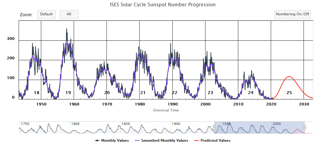 Sunspot numbers from solar cycle 19 to the prospective cycle 25. Credit: NOAA NWS Space Weather Prediction Center https://www.swpc.noaa.gov/products/solar-cycle-progression