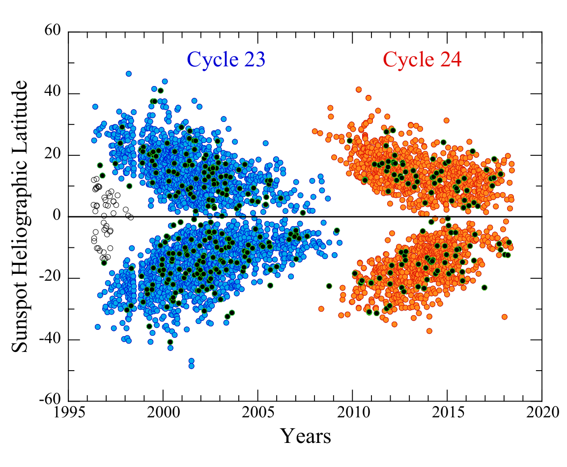 Sunspot butterfly diagram for solar cycles 23 and 24. Sunspots of a new cycle begin to appear at a relatively high latitude on the Sun. Sunspots of the old cycle form close to the equator. There is some overlap of spots from the old cycle seen at the same time as spots from the new cycle.
