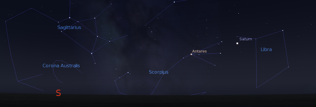 Saturn with the Zodiacal constellations of Libra, Scorpius and Sagittarius as the Teapot at 9:30 p.m. September 9, 2015. Created using Stellarium.