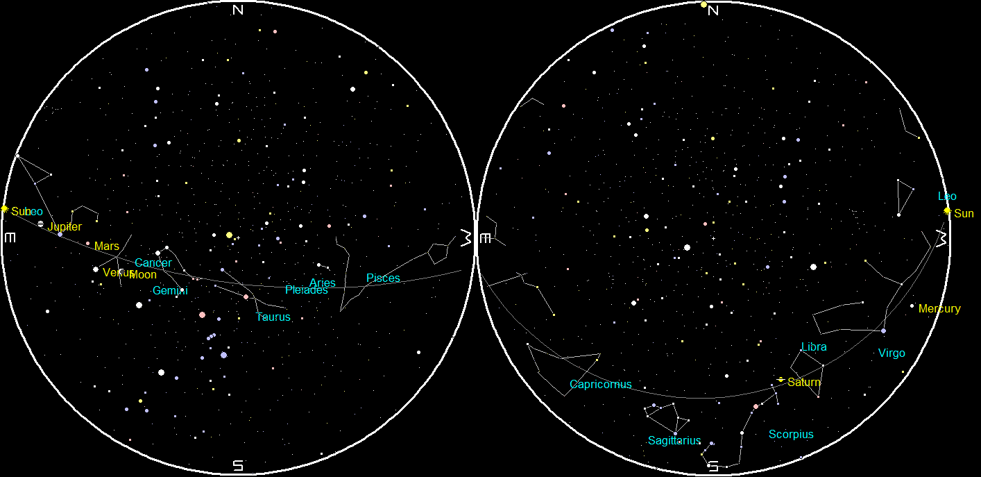 Planets at Sunrise and Sunset of a single night starting with sunset on the right on May 18, 2016. The night ends on the left with sunrise on May 19. If you are using Firefox right-click on the image and select View Image to enlarge the image. That goes for all the large images.