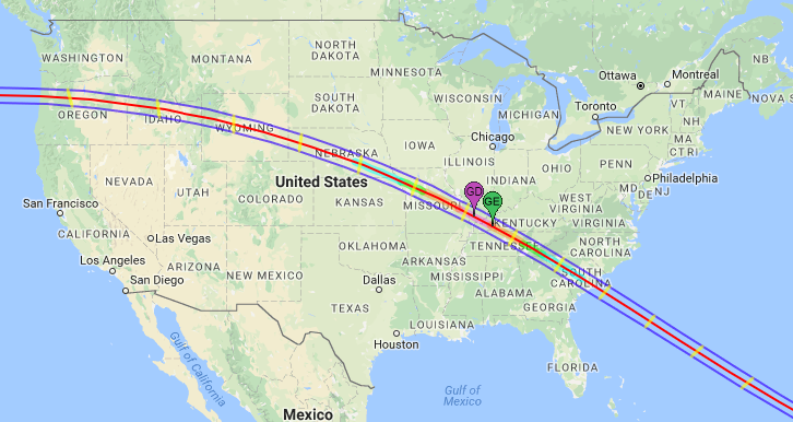 A screen cap of the map showing the path of totality of the August 21, 2017 total solar eclipse from NASA’s eclipse page. Credit: NASA and Google Maps.