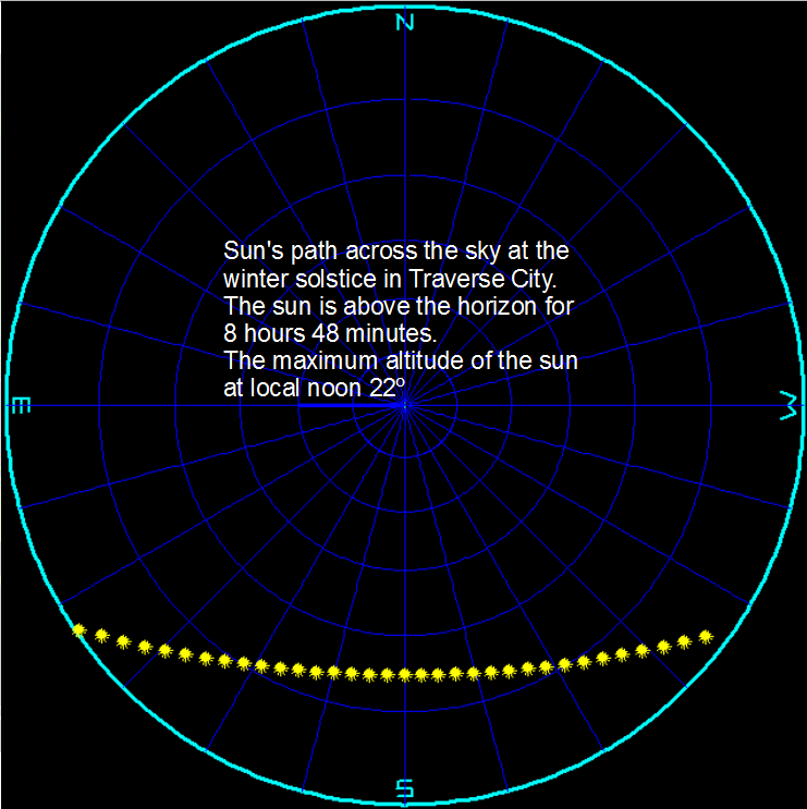 The above chart shows the diurnal path of the Sun at the winter and summer solstices for Traverse City, MI near 45º north latitude. Peak Sun altitude at noon at the winter solstice is 22º, while it’s 69º at the summer solstice.