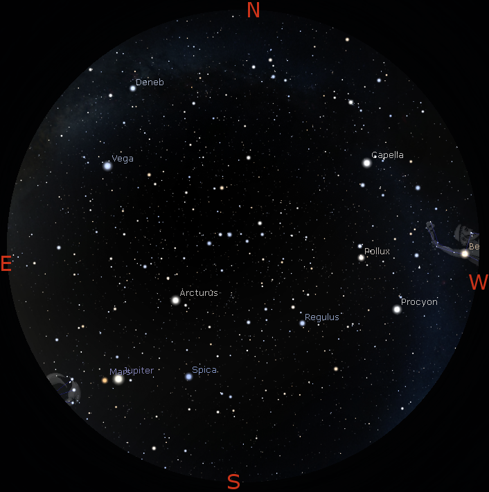 We come back to the central constellation of the winter sky Orion the hunter, now in the southeast at 9 p.m. with his three stars of his belt in a straight line, with his upper shoulder stars above and knees below. In one Greek story he was killed by the sting of a scorpion so the gods made sure the rising of the constellation Scorpius would chase him out of the sky to the west. To the Greeks he was a hapless hero. Orion is mentioned in the Bible in the book of Job. The name for Orion in Hebrew is Kesil, meaning “Fool”. To the native peoples around the Great Lakes, the stars here are those of the Wintermaker, who stretches his arms from Aldebaran in Taurus to Procyon in Canis Minor. When he is in the evening sky it is indeed winter.