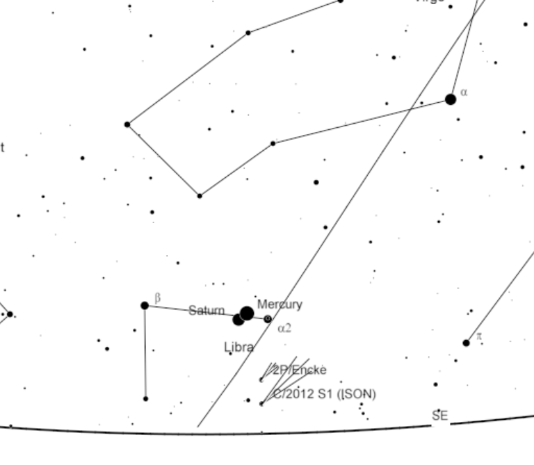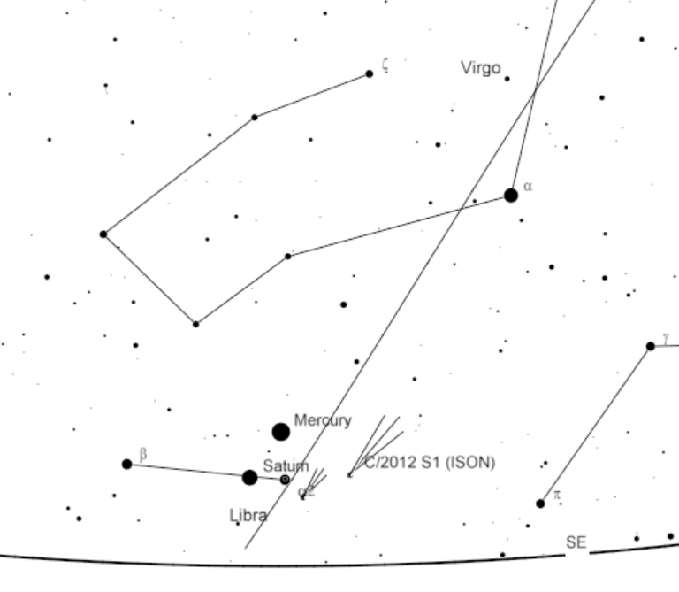 Chart for finding Comet ISON Saturday morning (November 23, 2013 at 7:00 a.m.). Chart created using Cartes du Ciel.